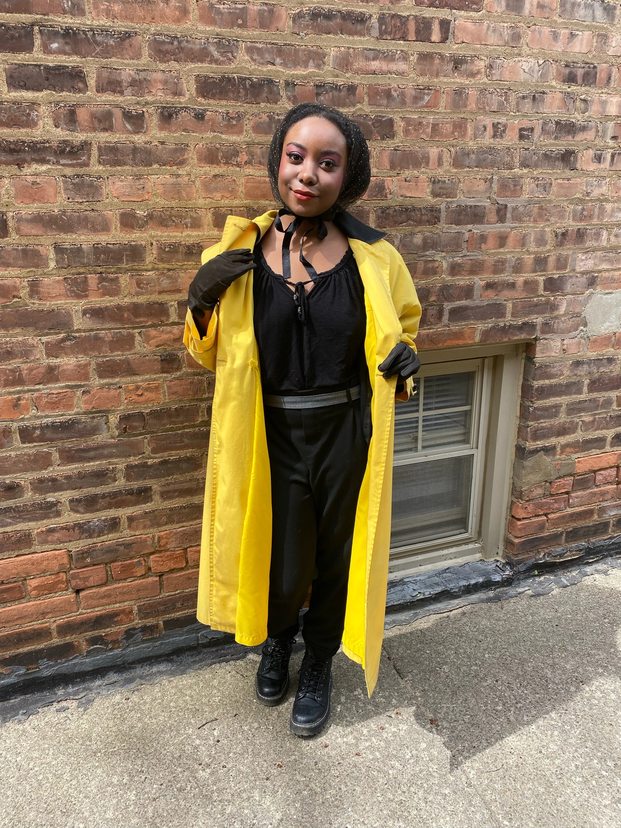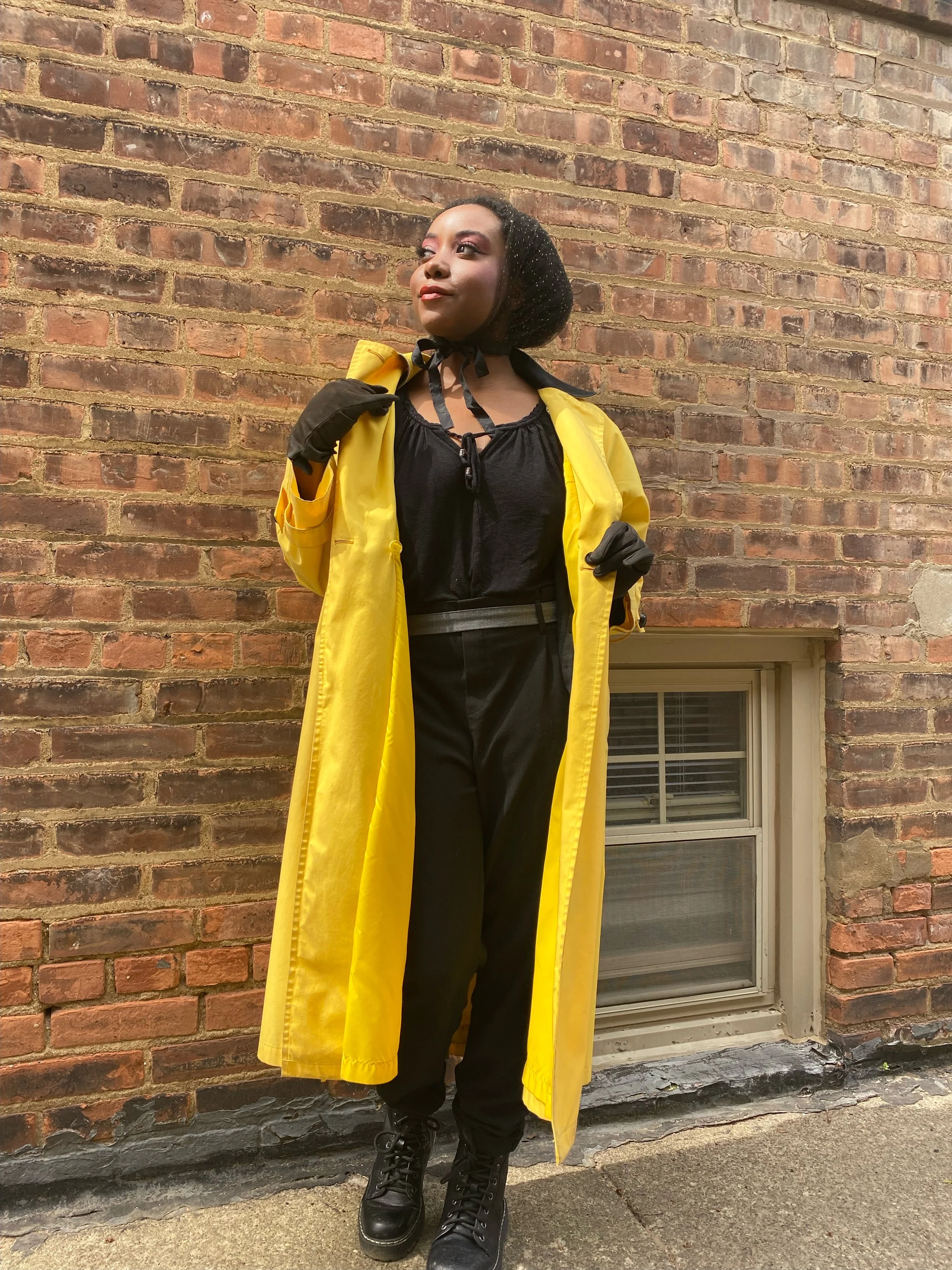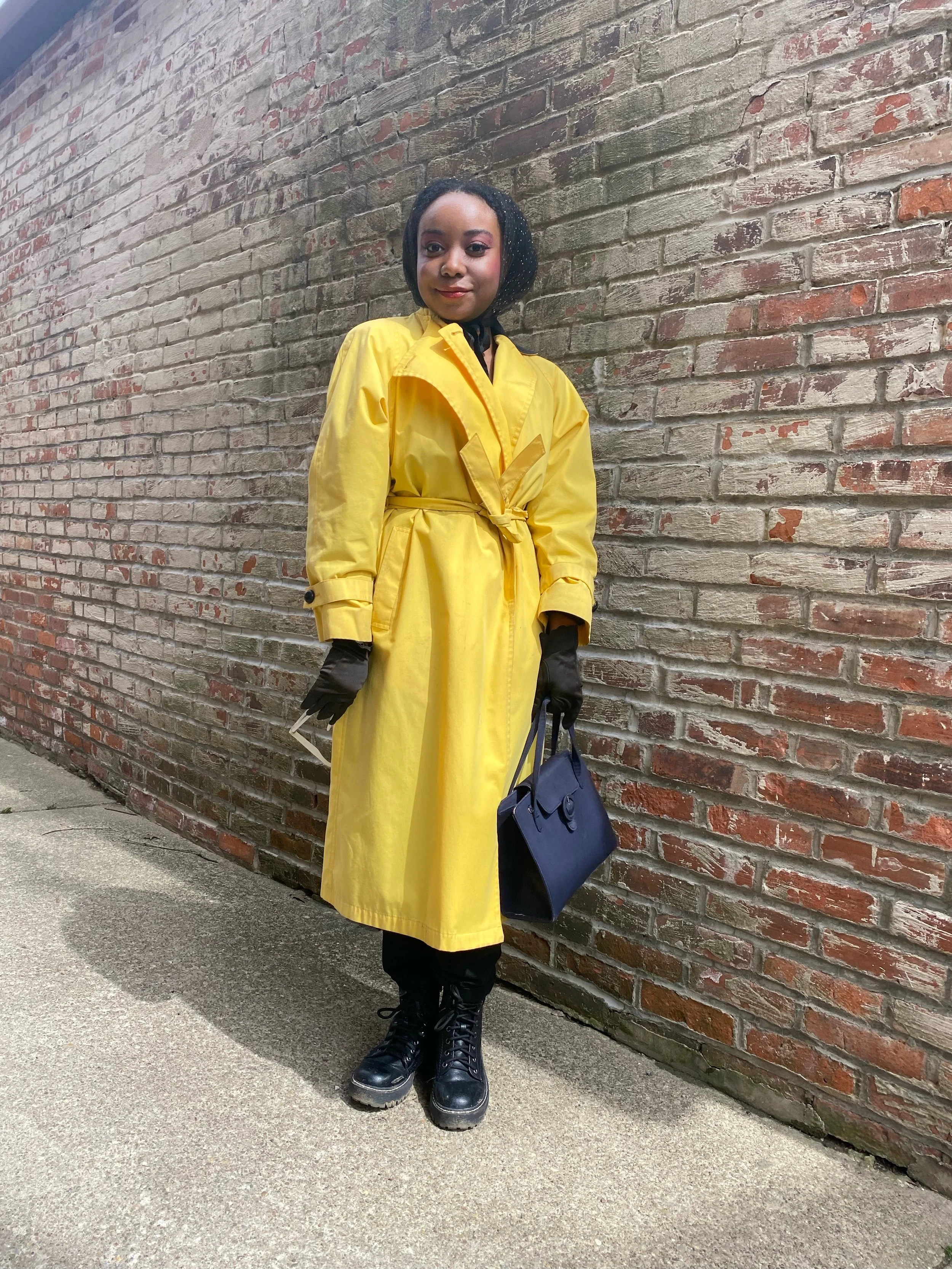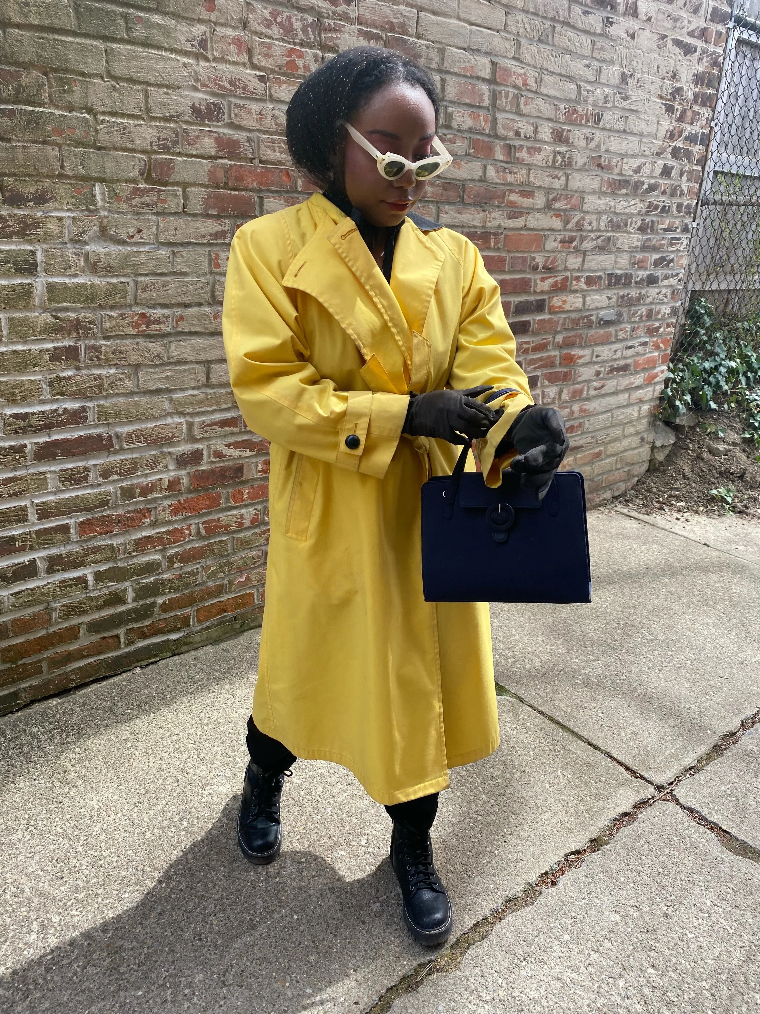 Let's talk about this fabulous vintage taxi cab yellow London Fog trench coat that I bought three years ago in New York City from Stella Dallas Vintage. I'm not entirely sure about the decade but based on the label, I'd guess this jacket was made in the 1970s/80s. I love the coat's dramatic flair with double collars, belted waist, and black details (buttons and top collar). This trenchcoat reminds me of the kinds that detectives would wear in old films.