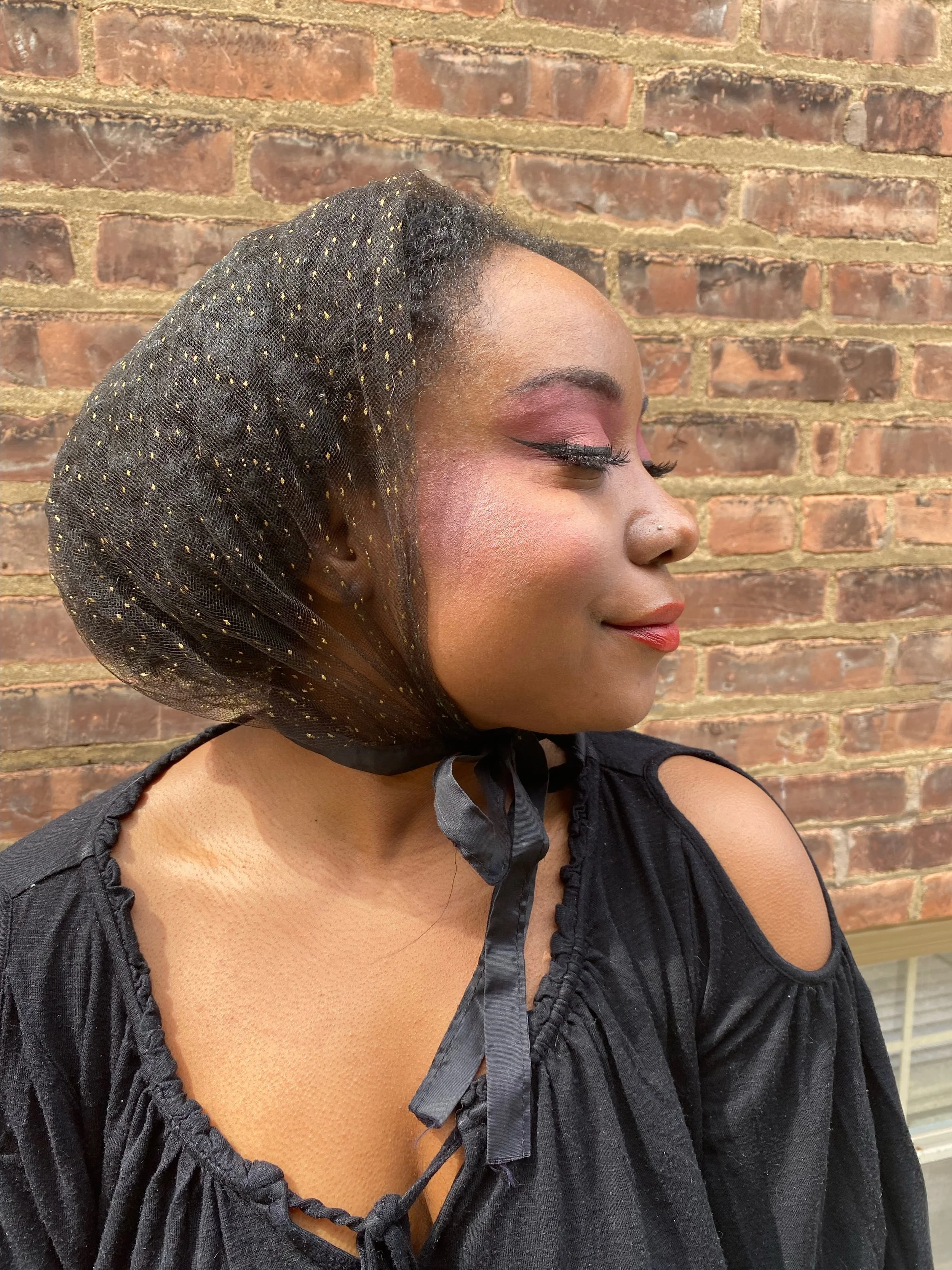 I wore my natural hair, pinned it up, and topped it with a vintage sheer black hair net that ties at the neck with ribbons. The net has gold speckles all over it that constantly catch the light. I bought this vintage hair net at Chelsea’s Costumes for $2.