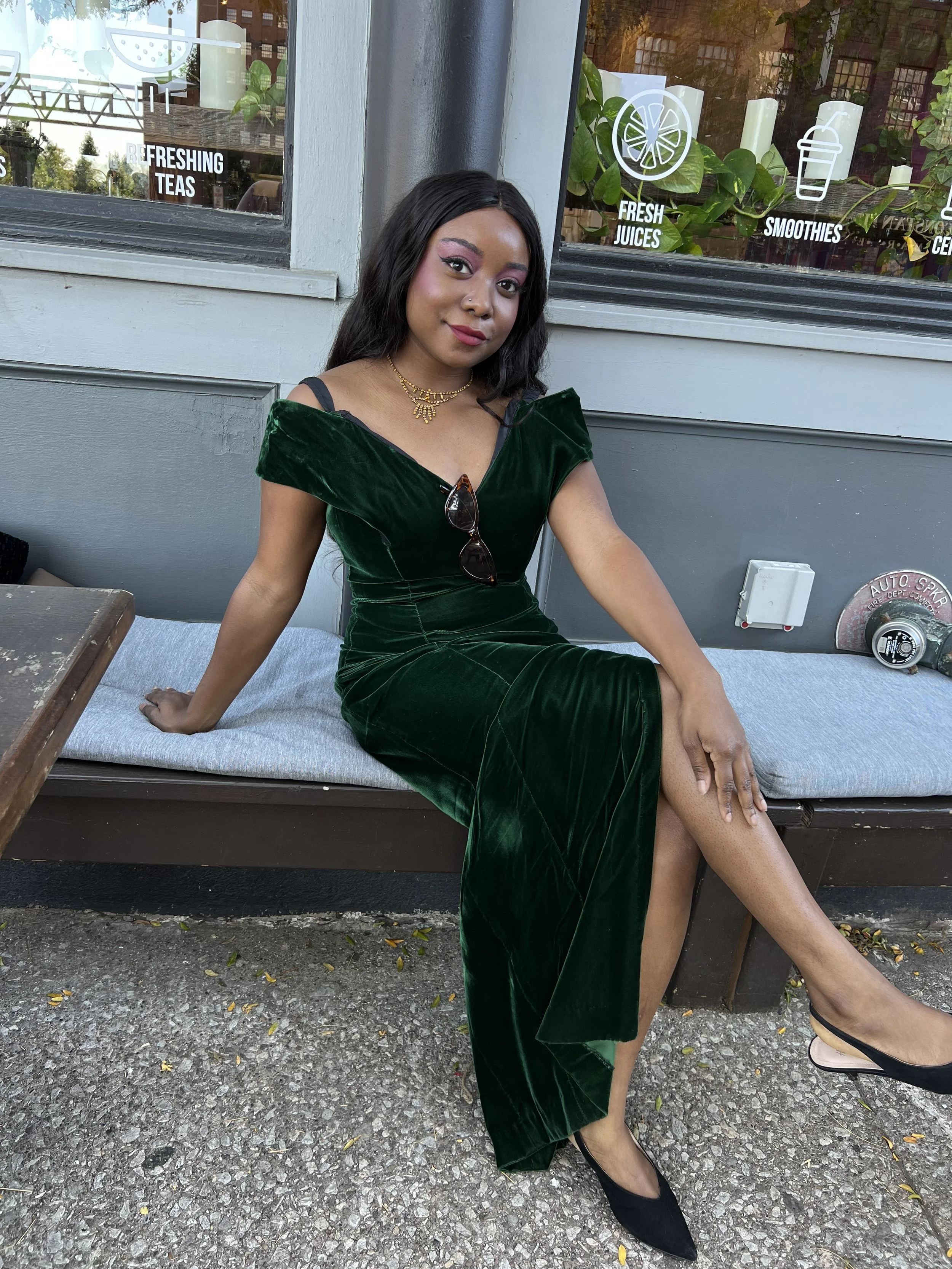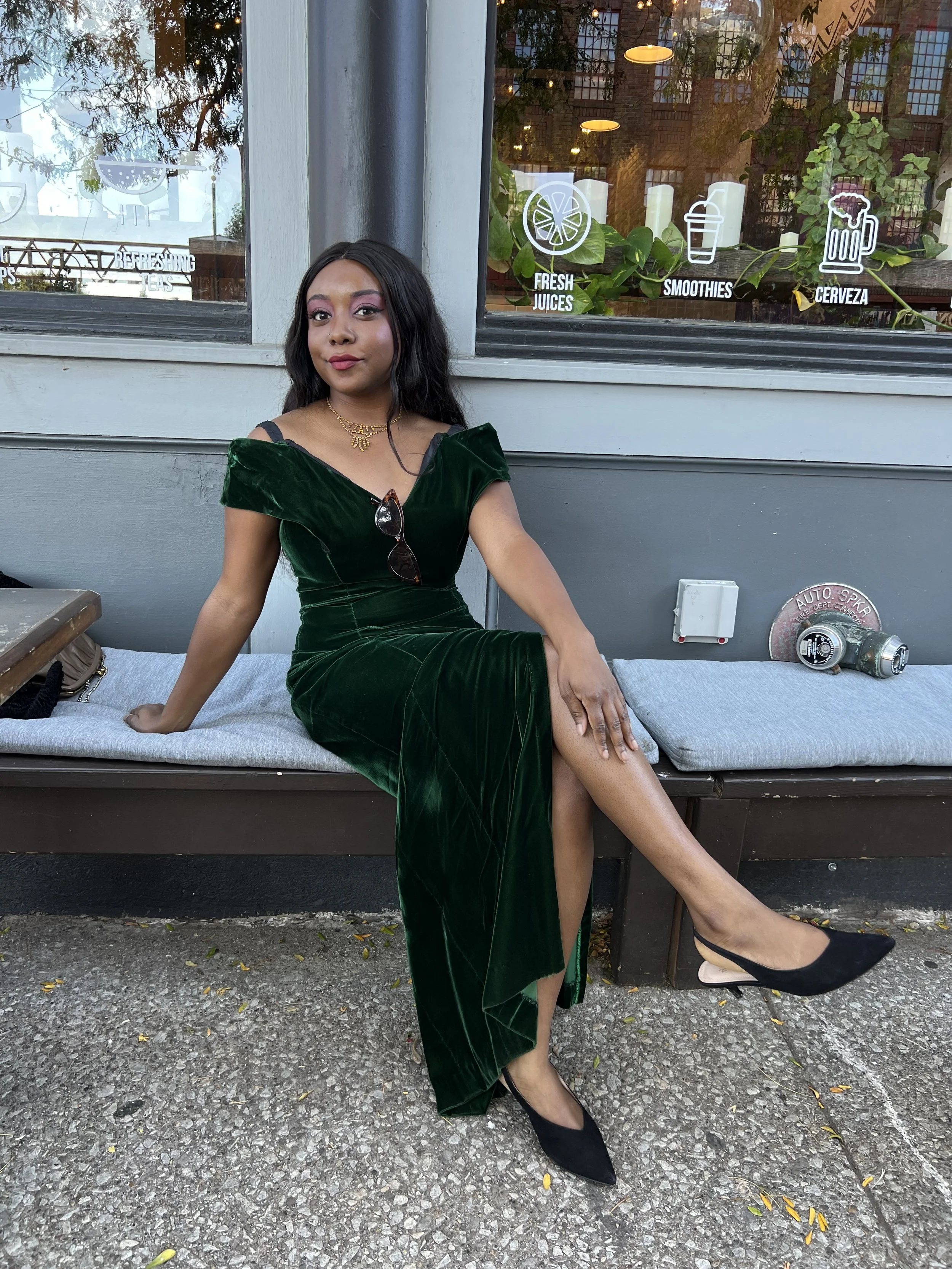 I decided to squeeze into one of my favorite vintage dresses of all time that I wore for my 25th birthday back in 2019. I haven't worn this dress since then and was surprised that it still fit. I also welcomed how it fit me slightly differently three years later, with a little weight gain and some differences in my figure. This deep green velvet vampy dream dress was created by Vivian Dessy Diamond for Dessy Creations in New York circa the 1980s. It was purchased from Chelsea's Costumes & Vintage Clothing in Cleveland.