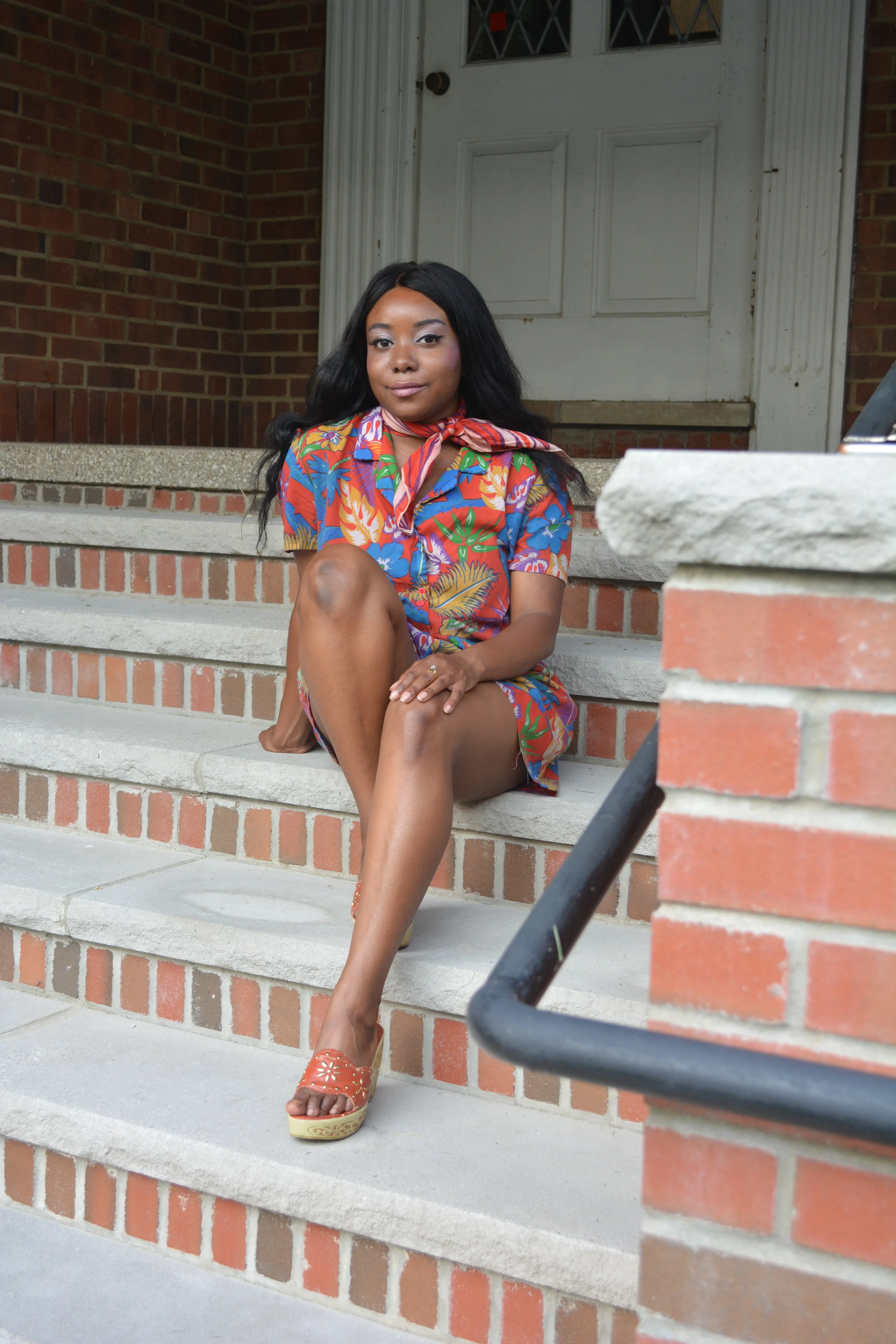 For my end of summer post, I decided to get festive and dress the part. This 1980s Hawaiian floral short sleeved romper is one of the comfiest articles of clothing that I own. It is short sleeved with a traditional shirt collar and has an elastic waist with buttons down the center front. I purchased this from Chelsea’s Costumes. I love pattern on pattern so I wore a vintage red, deep purple, and white scarf tied at the neck. For shoes, I opted for 1970s wedges that have wooden platforms engraved with a swirly pattern and has floral hardware on the large strap. These were purchased at Flower Child.