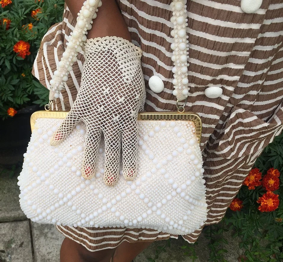 For my outfit, I decided to wear my ivory 1930s crotchet lace gloves and white 1950s beaded handbag with gold hardware. I wanted my accessories to match my dress exactly.