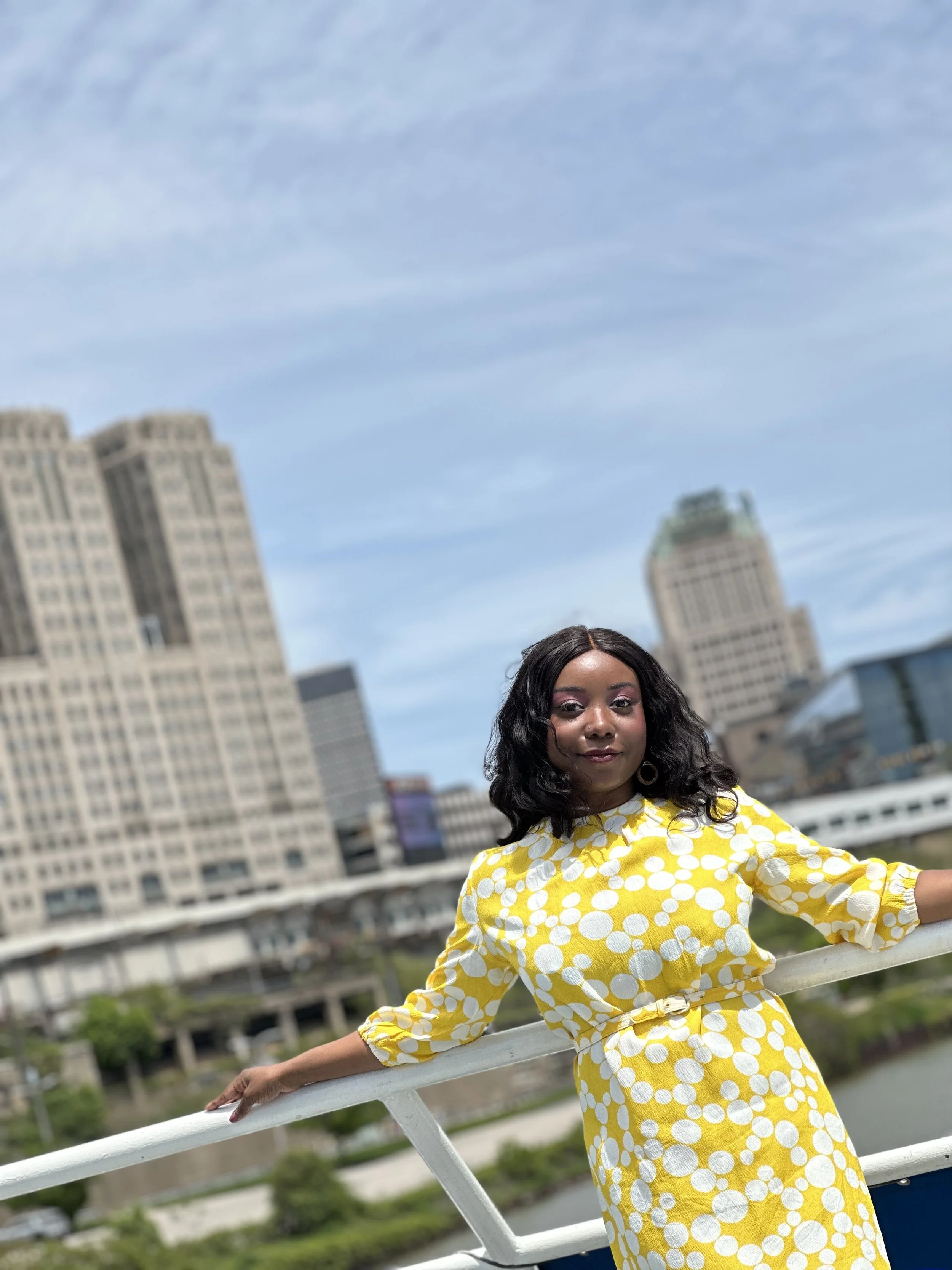 Finally, my new to me favorite vintage dress right now is this 1960s yellow and white bold little number. This dress may be handmade as there is no label, and some of the dress's finishings seem home-sewn. I absolutely love the bright powder yellow coloring of the dress contrasted by different size white circles that remind me of bubbles. The dress's length is perfect because it hits right at my knee! The belt provides a little cinch for me, but the dress is a tad too big for me, and I may eventually list this on my Depop and Poshmark! I purchased this dress from The Bomb Shelter in Akron, Ohio, which is, quite frankly, my favorite vintage shop.