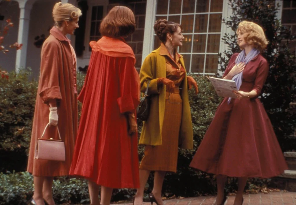 Inspired by Douglas Sirk's marvelous films, Far From Heaven features the bright, saturated color palettes we associate with Sirk's work. Costume designer, Sandy Powell (one of my favorite designers), does a marvelous job of using the clothing to evoke the coloring of technicolor. The set and props also follow this design, creating a world meant to showcase a facade.